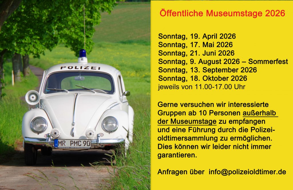 Liebe Freunde der automobilen Polizeigeschichte. Auch 2026 sind wir wieder bemüht unseren Besuchern Neuigkeiten und interessante Exponate aus der größten Polizeioldtimer Sammlung Deutschlands zu präsentieren. Wir freuen uns auf unsere Gäste an den folgenden Öffnungsterminen.